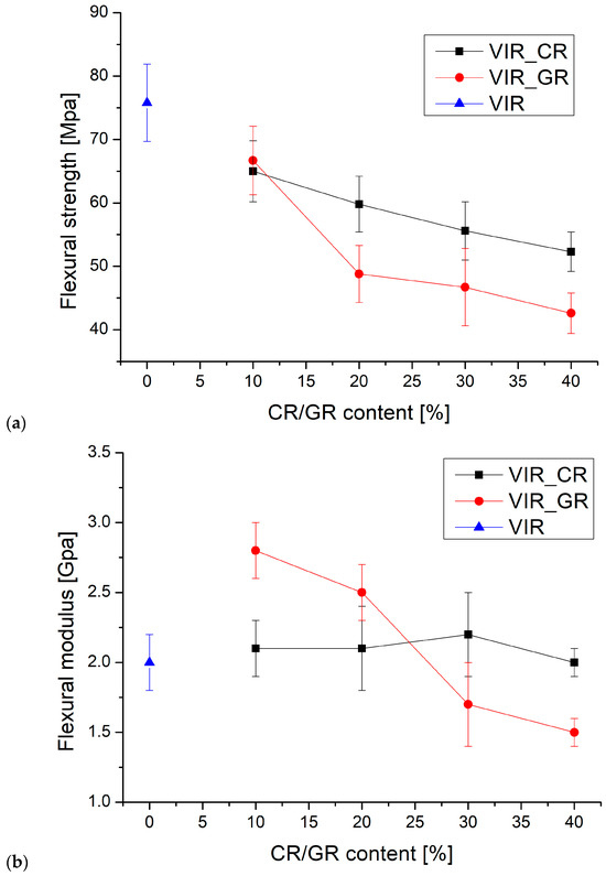 Finally, the cured samples were tested by three-point bending test. Figure 5 shows the average values of flexural strength (a) and modulus (b) versus the CR and GR contents.