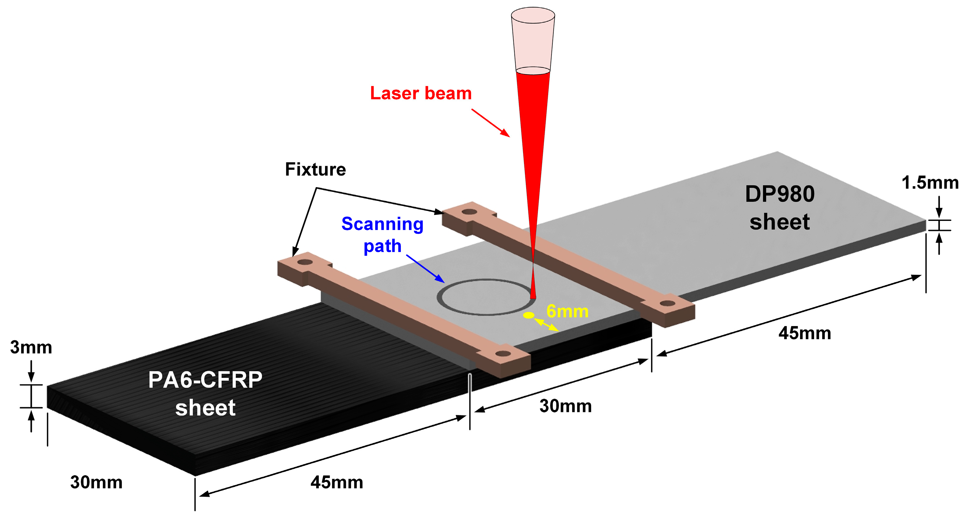 - Laser circle welding can join DP980 and PA6-CFRP successfully when the laser power was larger than 300 W with 12 mm/s scanning speed and 12 mm scanning diameter.