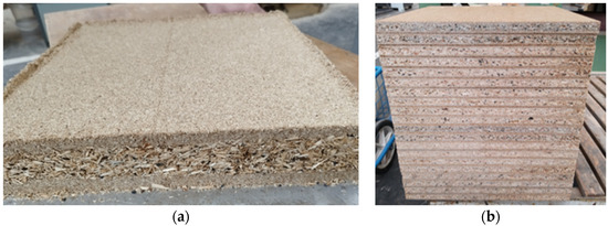 Particleboards processing: (a) mat formatting; (b) finished particleboards.