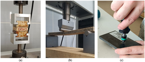 Mechanical properties: (a) methodology of internal bonding strength measurement; (b) methodology of bending strength measurement; (c) methodology of screw driving torque measurement.