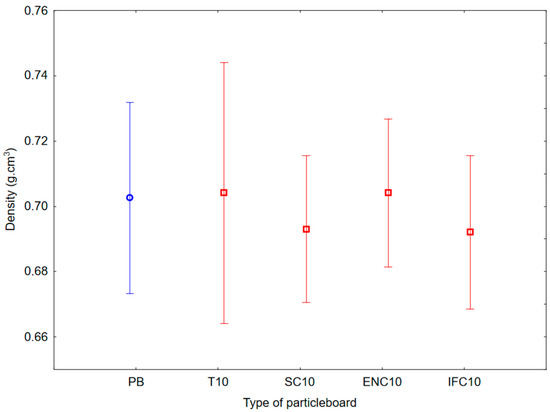 Graph of 95% confidence intervals for density of particleboards containing rubber filler: (PB) particleboard without rubber filler; (T10) particleboard containing 10% of waste tires; (SC10) particleboard containing 10% of waste seals and carpets; (ENC10) particleboard containing 10% of waste external non-flammable cables; (IFC10) particleboard containing 10% of waste internal flammable cables.