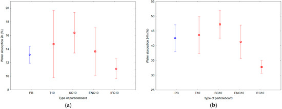 Graph of 95% confidence intervals for water absorption (WA) of particleboards containing rubber filler: (a) after 2 h; (b) after 24 h; (PB) particleboard without rubber filler; (T10) particleboard containing 10% of waste tires; (SC10) particleboard containing 10% of waste seals and carpets; (ENC10) particleboard containing 10% of waste external non-flammable cables; (IFC10) particleboard containing 10% of waste internal flammable cables.