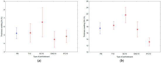 Graph of 95% confidence intervals for thickness swelling (TS) of particleboards containing rubber filler: (a) after 2 h; (b) after 24 h; (PB) particleboard without rubber filler; (T10) particleboard containing 10% of waste tires; (SC10) particleboard containing 10% of waste seals and carpets; (ENC10) particleboard containing 10% of waste external non-flammable cables; (IFC10) particleboard containing 10% of waste internal flammable cables.