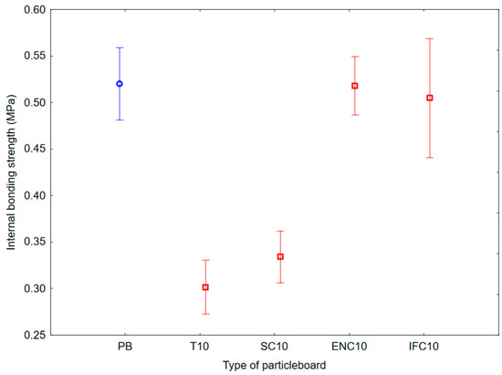 Graph of 95% confidence intervals for internal bonding strength (IBS) of particleboards containing rubber filler: (PB) particleboard without rubber filler; (T10) particleboard containing 10% of waste tires; (SC10) particleboard containing 10% of waste seals and carpets; (ENC10) particleboard containing 10% of waste external non-flammable cables; (IFC10) particleboard containing 10% of waste internal flammable cables.