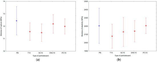 Graph of 95% confidence intervals for bending strength (BS) of particleboards containing rubber filler: (a) modulus of rupture; (b) modulus of elasticity; (PB) particleboard without rubber filler; (T10) particleboard containing 10% of waste tires; (SC10) particleboard containing 10% of waste seals and carpets; (ENC10) particleboard containing 10% of waste external non-flammable cables; (IFC10) particleboard containing 10% of waste internal flammable cables.
