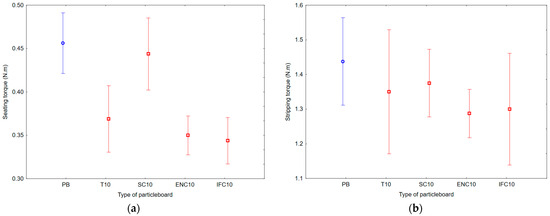 Graph of 95% confidence intervals for screw driving torque (SDT) of particleboards containing rubber filler: (a) seating torque; (b) stripping torque; (PB) particleboard without rubber filler; (T10) particleboard containing 10% of waste tires; (SC10) particleboard containing 10% of waste seals and carpets; (ENC10) particleboard containing 10% of waste external non-flammable cables; (IFC10) particleboard containing 10% of waste internal flammable cables.