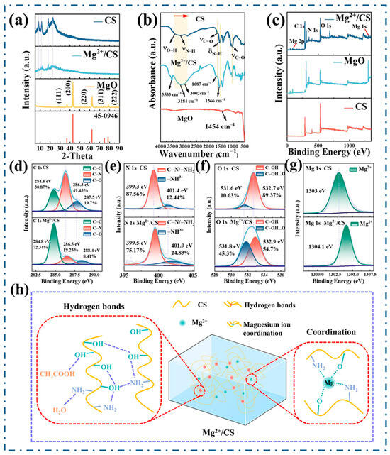 Figure 2a presents the XRD patterns of CS, MgO, and Mg2+/CS. The characteristic diffraction peaks of CS were observed at 8.3°, 11.5°, 18.1°, and 22.9° [22]. For MgO, diffraction peaks corresponding to the (111), (200), (220), (311), and (222) planes are observed at 36.9°, 42.9°, 62.3°, 74.7°, and 78.6°, respectively, consistent with the cubic phase of MgO as indicated by the standard JCPDS file (45−0946) [23]. Compared to pure CS, the intensity of peaks at 11.5° and 22.9° in Mg2+/CS is reduced, suggesting a decrease in the crystallinity of CS [24]. Notably, no characteristic peaks of MgO are present in the XRD pattern of Mg2+/CS, confirming that MgO is absent, as anticipated. This result indicates that MgO has reacted with the acetic acid used to dissolve CS, leading to the formation of Mg2+.