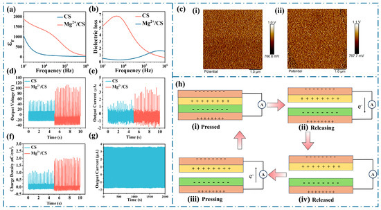 Figure 3. (a) Relative dielectric constant of CS and Mg2+/CS, (b) dielectric loss of CS and Mg2+/CS, (c) KPFM image at the 1 μm scale: (i) CS (ii) Mg2+/CS, (df) VOC, ISC, and σSC of CS and Mg2+/CS, (g) Stability test of Mg2+/CS, (h) stepwise working mechanism of the Mg2+/CS−TENG, in the figure, orange represents copper, yellow represents CS, and green represents FEP.