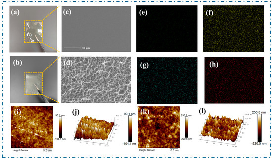 Figure 4. Photographs and SEM, EDS, and AFM images: (a) photograph of CS, (b) photograph of Mg2+/CS, (c) SEM image of CS at 50 μm scale, (d) SEM image of Mg2+/CS at 50 μm scale, (eh) EDS images of N, O, Mg, and C in the Mg2+/CS, (i,j) AFM images of CS at 10 μm scale, (k,l) AFM images of Mg2+/CS at 10 μm scale.