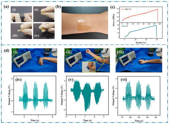 Figure 5. Mechanical properties and applications of Mg2+/CS: (a) flexibility demonstrations of Mg2+/CS: (i) tension, (ii) folding, (iii) curling, (iv) kneading, (b) skin adhesion demonstration of Mg2+/CS, (c) stress–strain curves of CS and Mg2+/CS, (d) application of Mg2+/CS−TENG in wearable electronic devices: (i,iv) wrist joint, (ii,v) elbow joint, (iii,vi) finger joint.