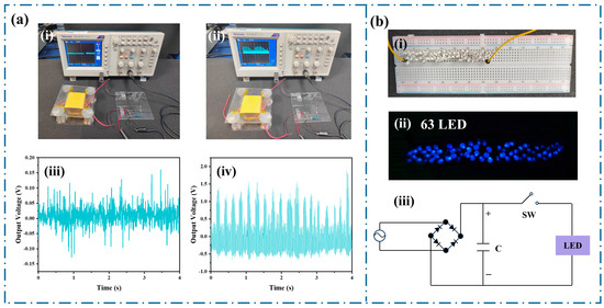 Figure 6. Application of Mg2+/CS−TENG in self−powered systems, (a) Mg2+/CS−TENG driving a small photodetector: (i) photograph of the device in a static state, (ii) voltage change on the oscilloscope after pressing Mg2+/CS−TENG for power supply, (iii) voltage across the photodetector in a static state, (iv) voltage across the photodetector after pressing Mg2+/CS−TENG to drive it, (b) Mg2+/CS−TENG driving the LED: (i) LED not lit, (ii) LED light up after pressing Mg2+/CS−TENG, lighting 63 LEDs, (iii) circuit diagram of Mg2+/CS−TENG driving the LED.