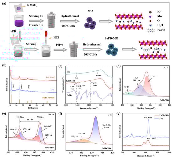 (a) Flowchart for the synthesis of PoPD-MO and MO. (b) XRD comparison images of PoPD-MO and MO. (c) FTIR spectra of PoPD-MO and MO. (d) C 1s, (e) Mn 2p, and (f) O 1s in the XPS spectra of PoPD-MO. (g) Raman spectrum of PoPD-MO and MO.