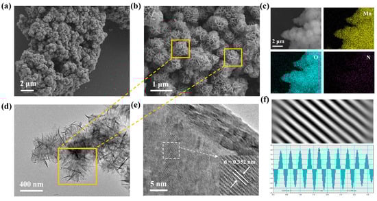 To observe the morphology of MO and PoPD-MO and to confirm that PoPD is embedded in the interlayers of MO, the morphological features and microstructures of two cathodes were characterized by scanning electron microscopy (SEM) and transmission electron microscopy (TEM). Figure 2a,b and Figure S2a,b (Supplementary Materials) depict the scanning electron microscope (SEM) images of PoPD-MO and MO at different magnifications, where both PoPD-MO and MO show 3D flower-like porous nanostructures composed of nanosheets. Compared with MO, the particle size of PoPD-MO is significantly reduced, which is mainly because the introduction of PoPD promotes the creation of oxygen vacancies, and these defects modify the crystals’ inherent stress state, resulting in a shift toward a denser crystal structure, and ultimately leads to a decrease in the radius [46]. In addition, the spheres in PoPD-MO were dispersed more uniformly without obvious agglomeration, indicating that the insertion of PoPD is favorable to the maintenance of the nanoflower structure, making it more compatible with the embedding and detachment of Zn2+. Furthermore, energy dispersive spectroscopy (EDS) provided clear evidence of Mn and O elements within the MO framework (Figure S3, Supplementary Materials). Figure 2c and Figure S4 (Supplementary Materials) also demonstrated the homogeneous dispersion of Mn, O, and N across the nanostructures of PoPD-MO, solidifying the presence of PoPD in the composite. Additionally, the transmission electron microscopy (TEM) images of the synthesized samples are presented in Figure 2d and Figure S5a (Supplementary Materials), in which PoPD-MO is a nanoflower-like structure assembled from nanosheets with diameters of about 400 nm, aligning well with the findings from the SEM tests. High-resolution transmission electron microscopy images (HR-TEM) (Figure 2e,f and Figure S5b, Supplementary Materials) show clear lattice striations of PoPD-MO and MO. We can observe that the interlayer spacing of MO is 0.289 nm, which corresponds to the (101) crystallographic plane. The introduction of PoPD increases the interlayer spacing to 0.352 nm. This expansion may stem from the introduction of PoPD, which acts as an interlayer intercalation of the sample, which enhances the stability of the structure, facilitates the embedding and dislodging of Zn2+, and increases the ion diffusion rate. Therefore, the above microscopic morphology analysis of the prepared material proves that we successfully synthesized PoPD-MO with a nanoflower-like structure.