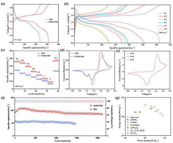 (a) GCD curves for both samples at 0.1 A g−1. (b) GCD curves of PoPD-MO. (c) Comparison of rate performance. (d) CV curves for both samples at 0.2 mV s−1. (e) CV curves of PoPD-MO at 1.0 mV s−1 for the fourth to sixth cycles. (f) Cycling performance at 3 A g−1. (g) Ragone diagram for PoPD-MO.