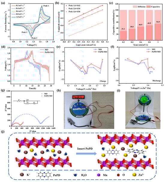 To elucidate the differences in Zn2+ diffusion kinetics between PoPD-MO and MO and to demonstrate their impact on energy storage performance, we conducted galvanostatic intermittent titration technique (GITT) tests (Figure 4d–f). The calculated average DZn2+ values for the PoPD-MO battery during charging and discharging were 3.459 × 10−11 and 2.470 × 10−11 cm2 s−1, respectively, which are higher than those of the MO battery (2.552 × 10−11 and 1.235 × 10−11 cm2 s−1). Therefore, PoPD-MO exhibits a larger diffusion coefficient, facilitating the rapid diffusion of Zn2+ and resulting in superior electrochemical performance. Figure 4g illustrates the electrochemical impedance spectroscopy (EIS) curves of the two materials and their equivalent circuit diagrams. It can be seen that the electrochemical impedance spectral curves of both PoPD-MO and MO consist of a semicircle and a diagonal line. Where the semicircle is attributed to the charge transfer resistance (Rct) and the slash is attributed to the diffusion of Zn2+ to the electrode. The calculated charge transfer resistances of the MO cathode and PoPD-MO cathode are 1080 Ω and 314 Ω, respectively, which indicates that the insertion of PoPD greatly reduces the charge transfer resistance and enhances the conductivity of the cathode material. The decrease in charge transfer resistance may be attributed to the introduction of PoPD, which enlarges the interlayer spacing of the MO and thus improves the ion transfer efficiency. In addition, Figure S13 (Supplementary Materials) shows the Nyquist plots before and after PoPD-MO cycling, and by fitting and calculating the EIS curves, we found that the Rct value changed from 314 Ω to 336 Ω after 100 cycles of PoPD-MO, which indicated that there was no significant change in the charge transfer resistance of the cathode of PoPD-MO after cycling. When using this material as the positive electrode to assemble a battery for testing, the results show that two button batteries connected in series can continuously light up an LED signboard (Figure 4h) and one button battery can make a small fan rotate continuously (Figure 4i), indicating that the PoPD-MO//Zn battery has a stable voltage, enabling it to supply power stably and showing great potential to become an excellent energy storage element. Thus, it can be seen that the PoPD-MO cathode performs very well in ZIBs. Combined with Figure 4j, we can infer that PoPD incorporation expands the interlayer distance of the cathode material, which not only accelerates the diffusion of Zn2+ and H+, but also enhances the stability of the material, and ultimately realizes the improvement in the battery capacity.