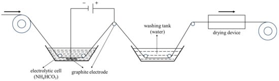 The CF production process entails preoxidation, carbonization, surface treatment (electrochemical treatment and sizing), and wire winding. In the electrochemical treatment process (Figure 1), the electrolysis temperature and time were 30 °C and 70 s, respectively, with NH4HCO3 solution (10 wt%) used as the electrolyte. The current densities considered were 0, 0.05, 0.10, 0.15, and 0.20 mA/cm2, and the obtained CFs were designated as CF-0, CF-1, CF-2, CF-3, and CF-4, respectively. The information of the CF samples are shown in Table 2.