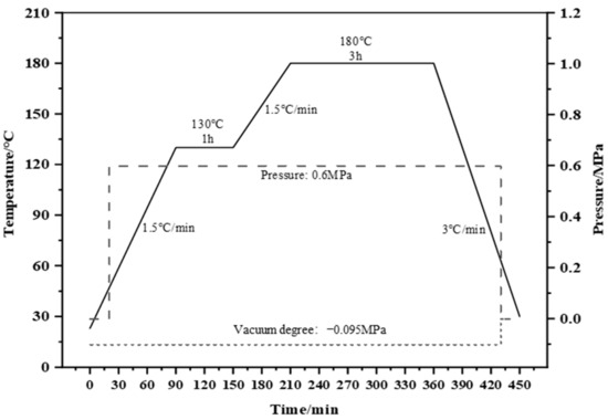 The CF/EP prepreg was prepared with a fiber area density of (145 ± 3) g/m2 and a resin content of 35% via the two-step hot-melt method. The prepreg was laid in the sequence [45/0/−45/90]4S according to ASTM D7136 (America Standard) [42] and GB/T 21239-2022 (China National Standard) [43], and the CF/EP laminates were manufactured using the autoclave molding method, conforming to the curing process depicted in Figure 2. The cured laminates were cut into impact samples (150 mm × 100 mm × 4.48 mm). The CF laminates had a CF volume fraction of 57%.