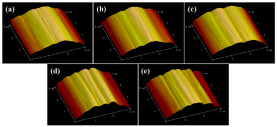 AFM images of the CF surfaces with different current densities: (a) CF-0; (b) CF-1; (c) CF-2; (d) CF-3; (e) CF-4.