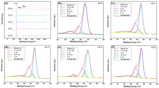 (a) Wide-scan spectra of the CF surfaces, showing the high-resolution C1s spectra: (b) CF-0; (c) CF-1; (d) CF-2; (e) CF-3; (f) CF-4.