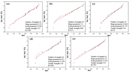 Monofilament strength fitting curves using Weibull distribution: (a) CF-0; (b) CF-1; (c) CF-2; (d) CF-3; (e) CF-4.