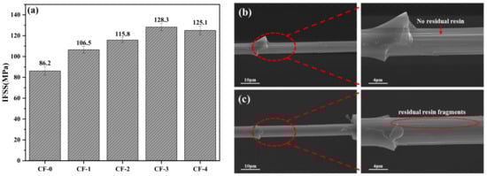 To further analyze the correlation between the current density and interfacial strength of the CFRPs, microsphere debonding tests, for determining the interfacial strength at microscale, were performed on the CF samples treated at different current densities. The IFSS improvements were thus characterized and the results are shown in Figure 8a. As evident from Figure 8a, the IFSS between CF-0 and EP is the lowest (86.2 MPa), owing to the inactive surface of CF-0. As the current density increased, the IFSS showed an upward trend, which is consistent with the chemical states of the CF surfaces. The highest IFSS value (128.3 MPa) was attained at 0.15 mA/cm2 and was 48.8% higher than the IFSS of CF-0/EP. As the current density continued to increase, the CF-4/EP IFSS (125.1 MPa) showed a consistent value with CF-3/EP. Considering the results of the surface morphology (Figure 4), chemical characteristics (Table 4), and wettability (Figure 6) of the CFs treated at different current densities, the IFSS variation can be analyzed from the following perspectives. First, there was no significant change in the groove shape and roughness of the CF surfaces, indicating that the electrochemical treatment at various current densities had little effect on the physical interlocking between CF and EP. Second, the electrochemical treatment increased the number of active functional groups on the CF surfaces to varying degrees, effectively improving the polar surface free energy and facilitating the wetting between the EP and CFs. Simultaneously, active functional groups, including –OH, –C=O, –COOH, and –NH2, on the CF surfaces were likely involved in the EP curing process, which helps to establish a chemical bonding between CF and EP. Consequently, the CF/EP IFSS significantly improved as the current density increased from 0 to 0.15 mA/cm2. Although excessive electrochemical treatment at 0.20 mA/cm2 caused slight oxidation etching, which led to a decrease in the number of active functional groups, the IFSS of CF-4/EP did not show significant reduction.