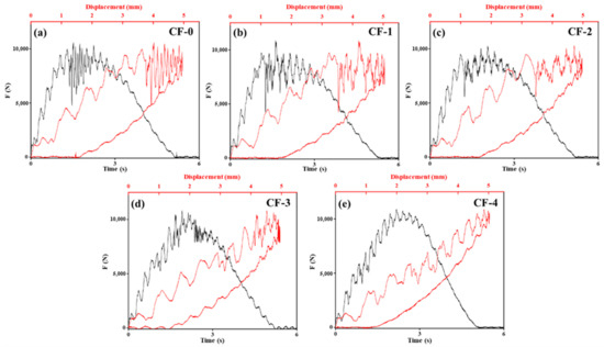 Impact load–time curves of CF/EP composites: (a) CF-0; (b) CF-1; (c) CF-2; (d) CF-3; (e) CF-4.