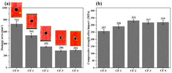 (a) Damage area of the samples after impact, along with nondestructive testing images; (b) compression strengths after impact of the CF/EP composites.