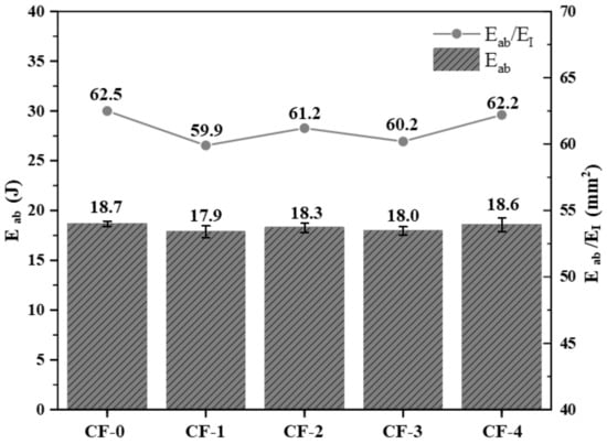 During the impact process, part of the impact energy (EI) was stored as elastic potential energy within the laminates, and this process was reversible. However, the remaining energy was absorbed by the sample, referred to as the absorbed energy (Eab). Integrating the enclosed area of the load–displacement curves can yield Eab during the impact process of the laminates. From Figure 11, the Eab results indicate that the energy absorbed by each group of samples during the impact process was essentially the same.