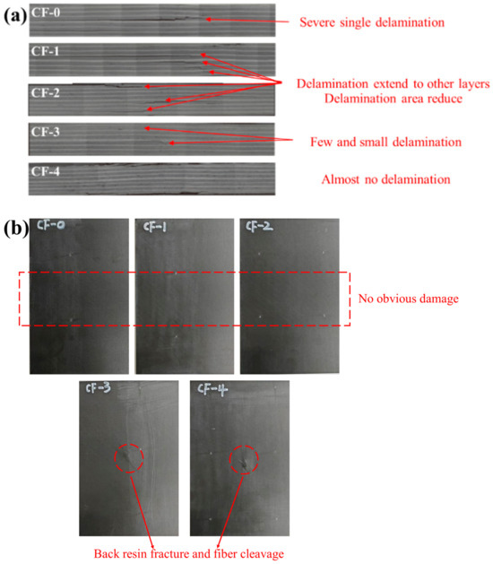 (a) Damage on the back of the series CF/EP samples after impact; (b) internal damage of the series CF/EP samples after impact.