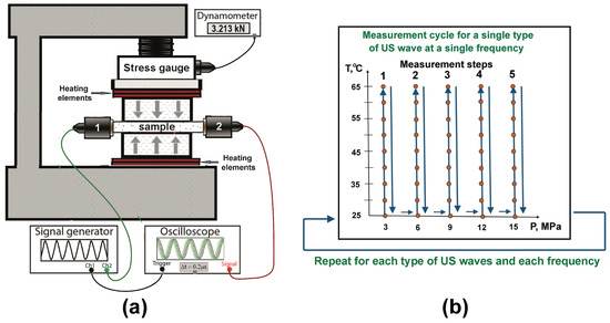 For measurements of variations of the moduli values with temperature, we used the previously developed setup [61] with some minor modifications. The setup comprised a jaw vice, a high-precision stress gauge, a set of piezoelectric transducers used for generation and detection of longitudinal (P121, Amati Acoustics, St. Petersburg, Russia) and shear (V154-RB, Olympus, Waltham, MA, USA) ultrasonic waves, a pulse generator (AM300 Dual Arbitrary Generator, Rohde&Schwarz, Munich, Germany), an oscilloscope (RTB2002, Rohde&Schwarz), and heating elements attached to the jaws. The setup schematics is shown in Figure 1a, the flowchart of the measurement procedure is illustrated in Figure 1b. The pressure applied to the sample was varied within the range of 0–15 MPa and was monitored by the stress gauge. Continuous control was required because temperature variations of the sample could also influence the applied pressure.