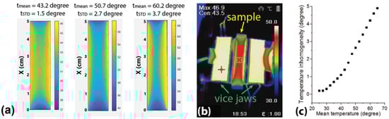 Spatial distributions of temperature in the sample were monitored using a thermal imager B20 (HIKMICRO, Huangzhou, China). The imager was calibrated by comparing its readings with those from thermocouple sensors attached to the sample. So far as the piezoelectric transducers providing generation and detection of ultrasonic waves were applied to the input and output cross-sections of the sample, a completely uniform temperature distribution could not be obtained. Utilization of the thermal imager for analysis of the sample temperature allowed for both determination of the average temperature of the sample in the course of its heating and assessment of temperature heterogeneity over the sample surface due to local heating from the jaws and contact with piezoelectric sensors. The observed temperature heterogeneity rose from 0.2 °C at temperatures close to room to 5 °C at high temperatures of about 65 °C (Figure 2c). Figure 2a presents temperature maps of the polystyrene sample at different mean temperatures, an example of the thermal image of the sample and vise jaws is shown in Figure 2b.