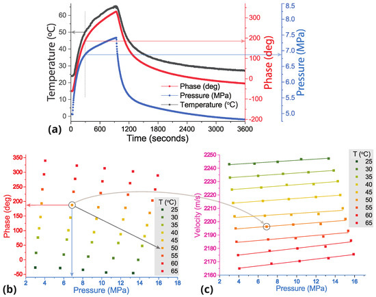 The data sets obtained at different static pressures and different temperatures , 30, …, 60, 65 °C provided values of the ultrasonic wave phase and its dependence on the applied pressure. These dependencies were constructed for each temperature: , , …(see Figure 3b). The velocities of ultrasonic waves as a function of applied pressure were calculated for each specific temperature using the equation: