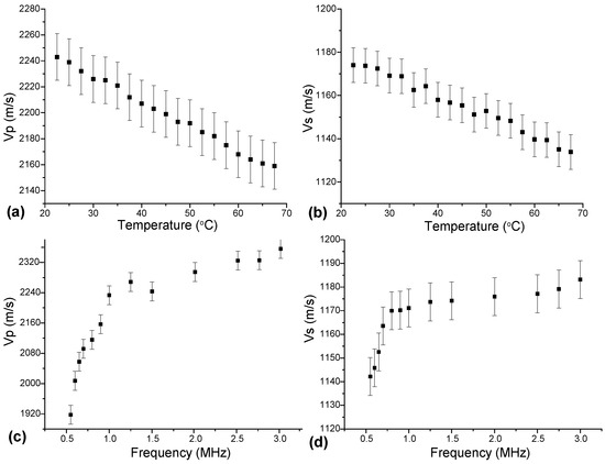 Velocities of longitudinal (Vp) and shear (Vs) ultrasonic waves as a function of temperature at the frequency of 1.5 MHz (a,b) and as a function of frequency at the temperature of 25 °C (c,d).