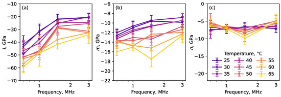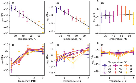 The determined above values of velocities of longitudinal and shear ultrasonic waves at different temperatures and frequencies and the obtained values of Lamé moduli and were further used to estimate the nonlinear elastic moduli using the Equations (3)–(5). The results obtained are plotted in Figure 5 and summarized in Table 2 for the lowest (0.7 MHz) and highest (3 MHz) frequencies of the ultrasonic waves used in experiments.