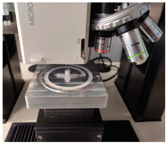 The mechanical properties were measured at a maximum of 6 distances (0 mm, 78 mm, 157 mm, 196 mm, 225 mm, 267 mm) when the melt reached this distance under the specified conditions. The individual distances were chosen with respect to the length of the run-in at different injection pressures. For an injection pressure of 20 MPa, the length of penetration was 157 mm. Based on this, 3 measurement areas were selected, namely right at the inlet (0 mm), at the end of the inflow (157 mm), and in the middle (78 mm). For an injection pressure of 40 MPa, the length of inflow was 196 mm. The measurement locations from the previous pressure were retained, and a location at the end of the inflow of 196 mm was added (4 measurement areas). For an injection pressure of 60 MPa, the length of inflow was 225 mm. The measurement locations were the same as for the 40 MPa injection pressure, and the final run-in length of 225 mm was added (5 measurement areas). For 80 MPa injection pressure, 6 measurement areas were set, which were the same as for 60 MPa injection pressure, and a final measurement at the end of the inflow of 267 mm was added. The reason for this specification of measurement areas was to capture the change in mechanical and structural properties along the length of the test specimens. And also, to be able to compare properties at different injection pressures in the same measurement areas. Mechanical properties were measured using an instrumented hardness test on a Micro-combi Tester (Figure 2) from Anton Paar (Graz, Austria). Table 4 shows the set measurement parameters. A Vickers indenter in the shape of a quadrilateral diamond pyramid with a peak angle of 136° was used as a hardness indicator. The measurements were performed by Depth Sensing Indentation (DSI), and the evaluation of the mechanical properties was performed by the Oliver and Pharr method. The measurements were done according to standard ČSN EN ISO 14577 [31,32,33,34]. For the micro-hardness test, low loading forces were applied with a measurement depth of the order of µm; only the indentation hardness, indentation modulus, and indentation creep were evaluated from the measured mechanical properties.
