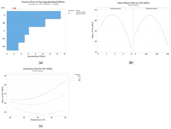 (a) Pareto chart of the standardized effects (response is indentation hardness HIT, α = 0.05), (b) Main effects plot for indentation hardness HIT (fitted means), (c) Interaction plot for indentation hardness HIT.