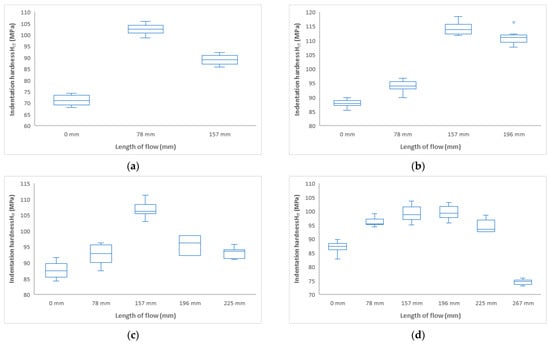 At the lowest selected injection pressure of 20 MPa, the injection hardness (Figure 4a) at the inlet (0 mm distance) was found to be approximately 72 MPa. Towards the center of the sample (distance 78 mm), the indentation hardness increased significantly to 103 MPa. Near the end of the part, the indentation hardness was measured to drop to 89 MPa. The indentation hardness increased along the flow path by 43% (distance 78 mm) and by 24% (distance 157 mm).