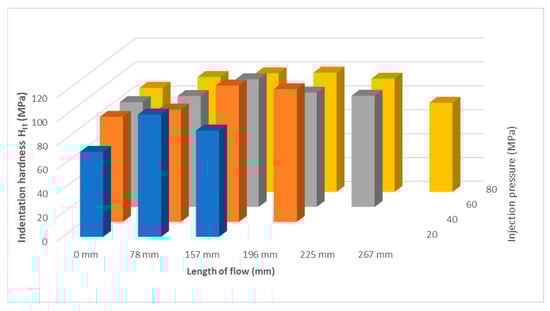 Comparing the results of the indentation hardness at different injection pressures, it can be seen that the pressure has an effect on the mechanical properties along the length of the sample, in addition to the effect on the melt flow length. As can be seen in Figure 5, with increasing pressure, the length of the run-in increased, as did the length where the highest value of the indentation hardness occurred. The magnitude and course of the injection pressure have an effect on the formation of the final product structure, which determines the shape and properties.