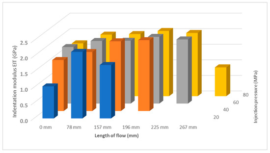 From the present results, it can be considered that the change in injection pressure has a positive effect on the length of flow, but it is also reflected in the change in mechanical properties at different distances from the inlet (Figure 10). Due to the shorter flow path, and thus a more uniform temperature field in the mold cavity at lower injection pressures, higher values of mechanical properties were measured. Changes in mechanical properties were also observed at different distances from the inlet, where the highest increase in mechanical property values (indentation hardness and indentation modulus) was measured at approximately the center of the test body. At lower pressures (20 and 40 MPa), no significant decrease in properties was observed, while at higher pressures, the decrease was significant. These changes can be attributed to the different heat-temperature fields during filling and cooling in the mold.