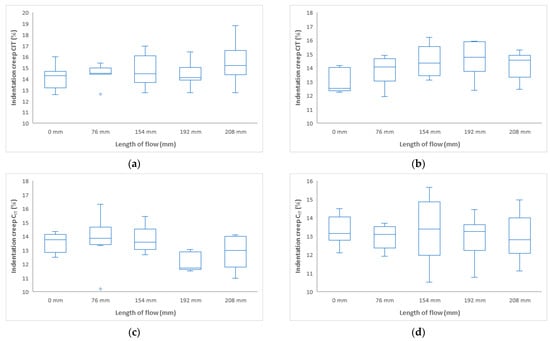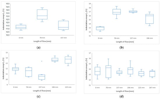 Dependence of indentation creep CIT on flow length at injection pressure (a) 20 MPa, (b) 40 MPa, (c) 60 MPa, and (d) 80 MPa.