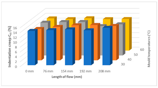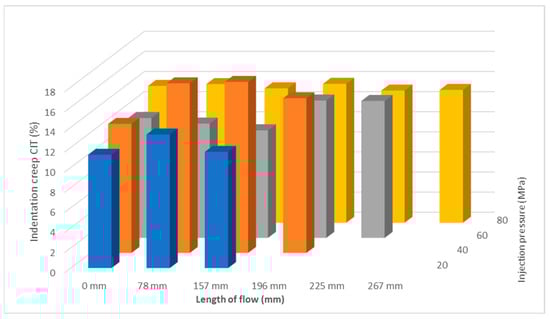 Indentation creep CIT (%) has the same tendency as the other two measurements in terms of mechanical properties (Figure 8 and Figure 9). The highest value of indentation creep was found for the sample injected at 40 MPa at 157 mm 17%.