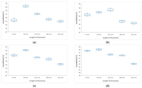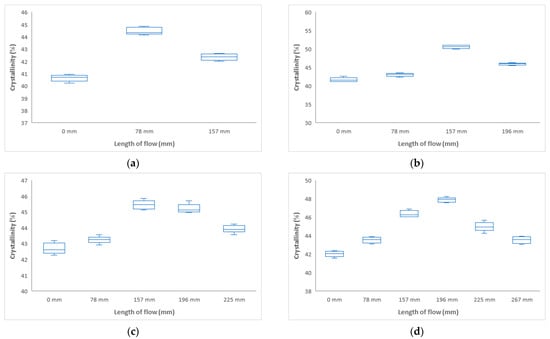 Dependence of crystallinity on flow length at mold temperature: (a) 30 °C, (b) 40 °C, (c) 50 °C, (d) 60 °C.