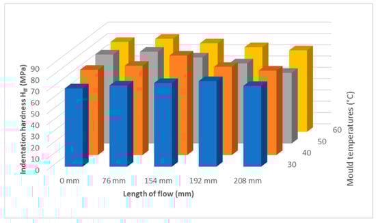 From the result shown in Figure 11a,b, it can be seen that at mold temperatures of 30 °C and 40 °C, the indentation hardness first increased to approximately the middle of the distance of the injected sample (at 192 mm distance, hardness 76 MPa, and at 154 mm distance, hardness 88 MPa), and then a decrease in indentation hardness was observed towards the end of the part, to values close to the values at the inlet (69 to 75 MPa). The difference between the sprue, the end of the part, and the center of the part was 17%.