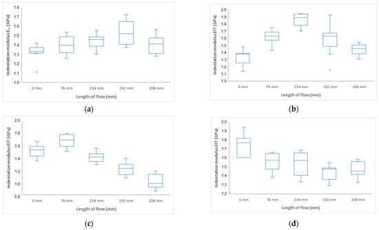 Dependence of indentation modulus EIT on flow length at injection pressure (a) 20 MPa, (b) 40 MPa, (c) 60 MPa, and (d) 80 MPa.