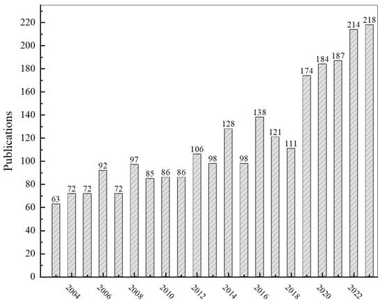 The history of the melt-blown nonwoven process can be traced back to 1954, when the U.S. Naval Institute developed the melt-blown nonwovens technology with the objective of collecting radioactive particles in the upper atmosphere. At that time, the process could produce microfibers or fibers with diameters of less than 10 m. In the 1960s, Esso Research and Engineering (subsequently renamed ExxonMobil) enhanced and expanded its production lines and mold widths, thereby achieving the successful production of polypropylene (PP) microfibers at a low cost. Subsequently, research on melt-blown nonwoven processes and equipment has progressed at a rapid pace, and the application areas of melt-blown technology have been expanding [1]. As illustrated in Figure 1, the number of research papers in this field has been increasing annually for the past two decades, reaching a peak of over 10 papers per year in 2023. This growth can be attributed to the emergence of the New Crown epidemic in 2020, which led to a surge in research activity in this area.