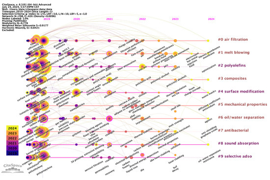 Despite the rapid advancement of melt-blown nonwoven technology, there has been a paucity of reviews on this topic in recent years. This paper, however, employs CiteSpace software (v.6.3.R1 (64-bit)) to synthesize the findings from the core database of the Web of Science over the past five years and conduct keyword clustering and time mapping analysis [2]. For further details, please refer to Figure 2. The modular value Q = 0.778 indicates that this co-occurring network clustering structure has a high degree of significance. The average contour value S = 0.9177 indicates that the co-occurrence network clustering results have a high degree of confidence. The 298 keyword nodes are divided into 11 clusters, with the size of the keyword circle logo positively correlated with frequency. Each clustering module is labeled with a number from 0 to 11. The clustering structure depicted represents the research hotspots to a certain extent, which include: the following topics were identified: air filtration, melt blowing, polyolefins, composites, surface modification; mechanical properties, oil/water separation, antibacterial, Sound absorption and Selective. By further summarizing the clustering labels and their internal keywords, the research topics can be classified into three categories: raw materials for melt-blown nonwoven fabrics, melt-blown nonwoven fabrics technology, and applications of melt-blown nonwoven fabrics.