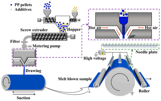 Melt-blown electret technology can overcome the limitations [35] of traditional melt-blown nonwoven filtration materials in capturing airborne hazardous substances. Melt-blown electret technology employs an electret charging process infuse melt-blown nonwoven fabrics with persistent electrical charges. This technology finds widespread application in N95 respirator materials and high-efficiency particulate air filtration systems [36]. Here, the electret is a dielectric that maintains long-term charge. Electric electret (EE) and water electret (WE) are currently widely used.