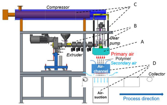 Nanoval split spinning nonwoven material process flow diagram: the Nanoval spinning beam itself (A), an extrusion system (B), a system for the supply of the hot process air (C), and the deposition and air treatment system (D) [45].