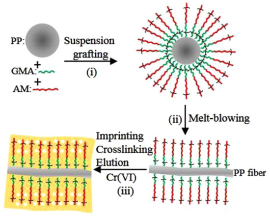 Melt-blown PP fiber has some inherent limitations, including low polarity, inadequate hydrophilicity, especially the absence of active functional groups, present challenges in its direct application for the removal of heavy metal ions from wastewater. Researchers have conducted investigations to address these shortcomings. Chen, H. et al. [63] used lab made fibers to prepare PP-g-GMA-DETA fibers based on Pearson’s HSAB theory to remove and from wastewater. Its maximum adsorption capacities of and in wastewater reached and 31.40 , respectively. Liu, C. et al. [64] prepared a PP hollow fiber membrane with selective adsorption properties. The prepared fiber exhibits high adsorption of Hg (II) ions in aqueous solution, with a maximum theoretical adsorption capacity of 0.854 . In order to remove and from water, Chen, R. et al. [65] utilized ultrasonic waves to promote chemical grafting. Benzoyl peroxide was employed as the initiator to graft methacrylic acid onto the surface of formed melt-blown PP fibers in an aqueous suspension system. Weakly acidic cation exchange PP-g-MAA fibers with a grafting rate of were prepared. The adsorption and removal rates of and were and , respectively. Guo. M. et al. [66] synthesized PP chelate fibers grafted with acrylic acid and acrylamide side chains by traditional melt-blown process and utilized them as adsorbents for the selective removal of Pb (II) ions from aqueous solutions. The time to reach half of the adsorption capacity of the fiber was 6.2 min. However, the process exhibited susceptibility to interference from ions. Luo, Z. et al. [67] employed the technique of suspension graft copolymerization of water and solid to modify granular PP with dual monomer glycidyl methacrylate and acrylamide. Subsequently, they produced -imprinted fibers through multi-component melt-blown process. The preparation principle is illustrated in Figure 6. The prepared -imprinted fibers exhibit excellent selectivity for , with a maximum adsorption capacity of at .