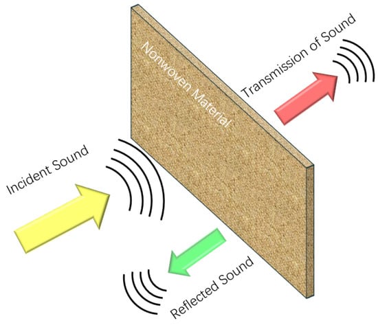 The reduction of noise can be achieved through three principal methods: at the source, at the ear, and during the transmission process. Three fundamental mechanisms exist for the reduction of noise during transmission: absorption, damping, and isolation [84,85,86]. “Sound insulation” refers to reducing the penetration of noise into other areas, while “sound absorption” refers to reducing the reflection and energy of sound on the surfaces. The sound absorption coefficient of a material depends on the degree of presence of air molecules on the surface of the material and in the pores [87,88,89]. As illustrated in Figure 7, when sound waves are incident vertically on the surface of the material, a part of them are reflected directly from the material surface, while the remainder are transmitted into the interior of the material through capillaries that permeate the outside. Most of the energy is absorbed due to scattering and vibration of the fibers, and heat exchange between the air and the material also causes attenuation of the sound wave energy. The sound absorption of porous non-woven fabrics is the consequence of the combined effects of air viscosity and heat transfer.